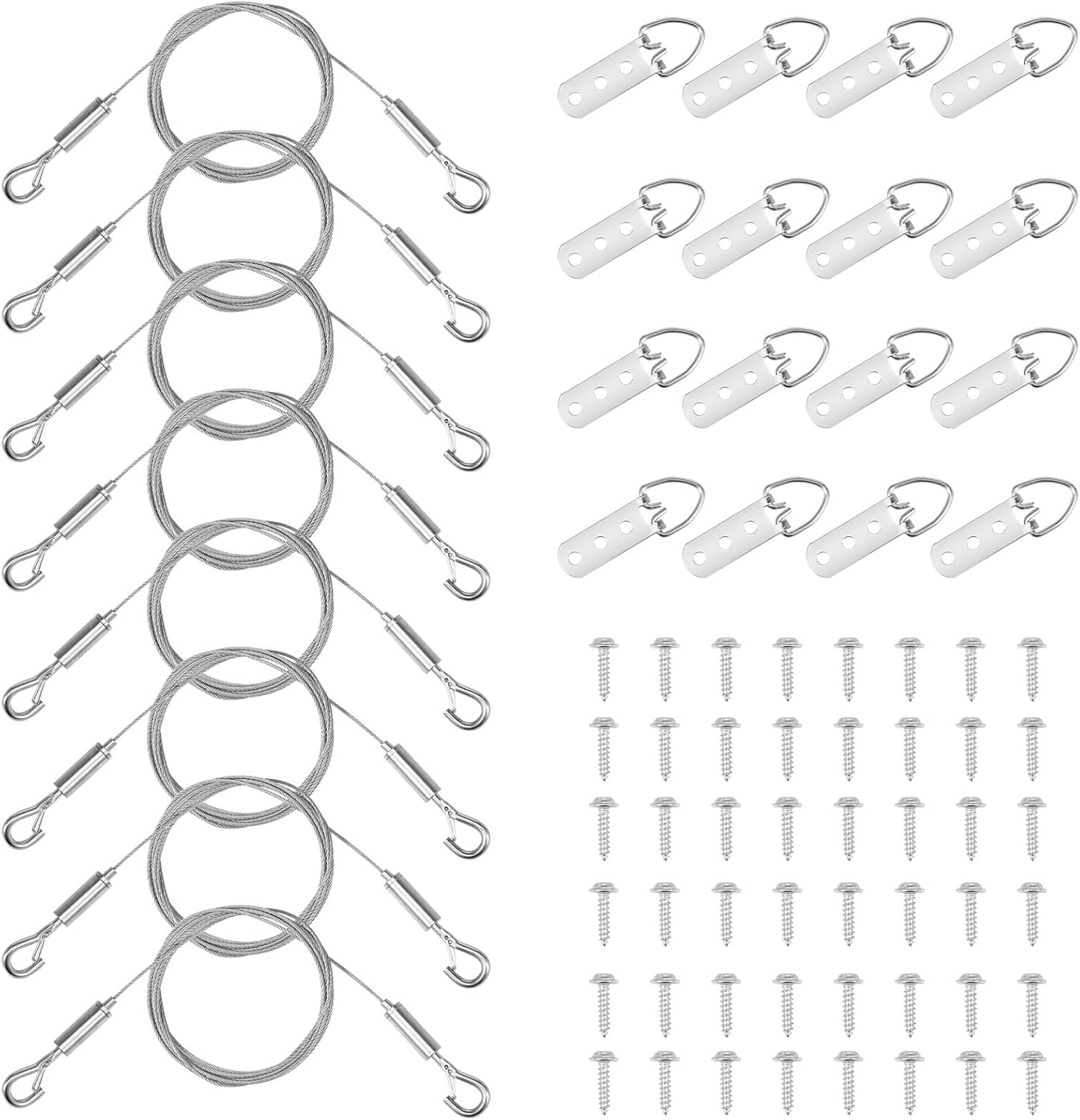 Description:This picture hanging wire kit comes with adjustable wires , D rings , and screws . With adjustable wire lengths , it provides flexibility and ease for your hanging needs , ideal for displaying picture frames , mirrors , artworks , and various wall decors .Key Feature :Widely Used : Ideal for homes , offices , commercial spaces , art exhibitions , libraries , cafes , and more .Specification :Product Name : Picture wire hanging kitSize : Steel Wire Length : 2meters/78.74inchHook : 60x18mm/2.36x0.71inch3 Hole D Ring : 6.3x2.2cm/2.48x0.87inchMaterial : Stainless SteelColor : SilverNote :1 . There may be slight differences between the picture and the actual color of the commodity . We will try our best to show you the exact color .2 . Please allow slight dimension difference due to manual measurement .