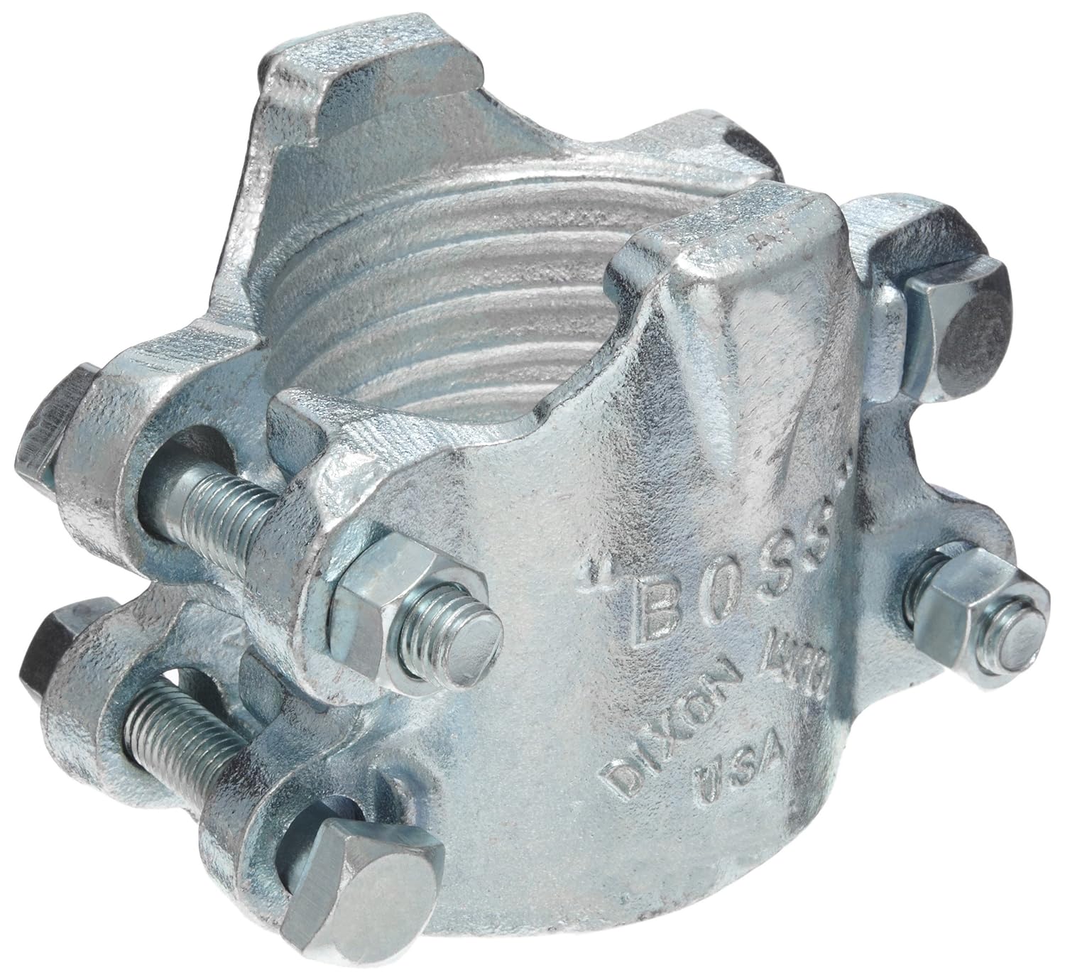 The bolts used in the Boss interlocking clamps are not standard bolts. These bolts can be retorqued, but it is not recommended that the bolts or clamps be reused, as they are designed for a single bend only. Torque values for clamps are based on dry bolts. The use of lubricant on bolts will adversely effect clamp performance. Do not lubricate nuts and bolts. Made of plated iron. 2 Gripping fingers. 4-Bolt type. Two clamp sections. 2" Hose ID. 2-32/64" - 2-50/64" Hose OD. Bolt no. MB8300. 60 ft lbs Torque.