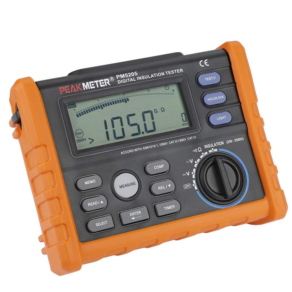 Specifications: Technical Parameter Insulation Test Output Voltage:250V (0 %~+20%),Measuring Range:0.01MΩ~250MΩ ± (3%+5) Output Voltage:500V (0%~+20%),Measuring Range:0.01MΩ~500MΩ ± (3%+5) Output Voltage:1000V (0%~+20%),Measuring Range:0.01MΩ~1000MΩ ± (3%+5) Output Voltage:2500V (0%~+20%),Measuring Range:0.1MΩ~2.00GΩ ± (3%+5),2.00GΩ~20.00GΩ ± (5%+0.2GΩ),20.0GΩ~100.0GΩ ± (10%+2GΩ) Output Voltage:1000V (0%~+20%) ,Measuring Range:5.00GΩ~10.00GΩ±(10%+0.2GΩ) Short Circuit Current:3mA Multimeter Functions DC Voltage Test :Measuring Range:0.1~1000V±0.5% AC Voltage Test:Measuring Range:0.1~750V±1% Continuity Test:Measuring Range:0.01Ω~200Ω±0.5% General Parameter Brand :PEAKMETER Model:PM5205 Color:Orange Power Supply:6 x 1.5V LR4 Batteries (NOT included) Item Size:18*14*6.5cm / 7.1*5.5*2.6in Weight Approx.:2285g Safety Rating:CE, CAT.III, 1000V, ETL Package Included: 1 x PM5203 Digital Insulation Tester 2 x Clips 2 x Test s 1 x Hand Bag