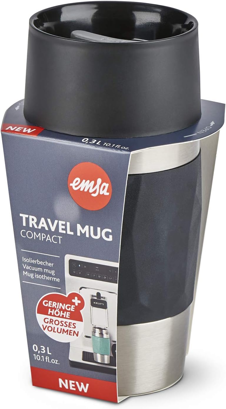 Take your Travel Mug Compact insulated mug from Emsa everywhere and enjoy the pure taste. The 100% leak-proof mug is ideal for on the go and features a double-walled vacuum insulation that keeps your drink hot for hours (4 hours for hot drinks and up to 8 hours for cold drinks). The compact, practical drinking cup with 360° all-round drinking opening has a capacity of 0.3 L and improved ergonomics with soft-touch silicone cuff for the perfect hold. Practical features complete the whole thing: dishwasher-safe, non-slip base and improved ergonomics for a firm grip.