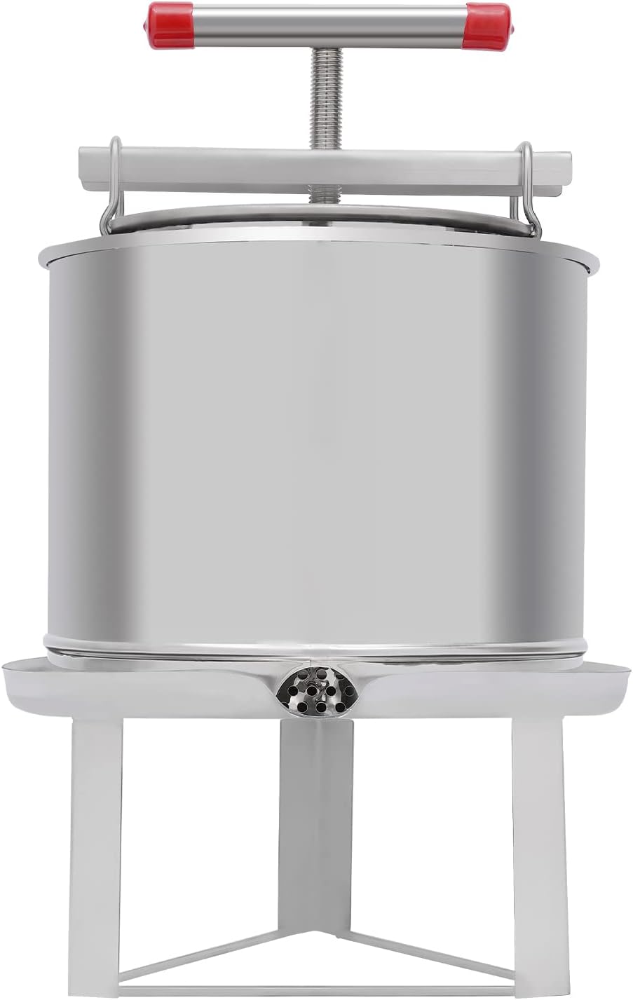 DetailsThickened Base Countertop: The base countertop is made of a whole steel plate, which makes the barrel more smoothly placed and effectively enhances the overall pressure resistance of the product.Curled Edges: The Fruit Honey Presser is designed with curled edges that won't hurt your hands.Handles: We have equipped handles on the bottom of the inner barrel and the outer barrel. It makes it easier for you to hold and not dirty your hands.How to Press HoneyYou can cut up the honey with a honey cutter and put it into a strainer, then put it into the mesh barrel, or pour the honey into the mesh barrel directly. Then press it with the pressure plate, align the screw with the middle hole of the pressure plate, and rotate it by holding the handle. Finally, the honey will flow out.How to Press WaxPut the wax residue to be pressed into the iron pot and melt it to boiling, then use a spoon to scoop it into the bag and put it into the machine to be pressed.How to Press Grapes or Other ItemsPut the grapes or other items you want to press into the bag and then put it into the machine and you can press it.ApplicationThis Fruit Honey Presser is mainly used in farms, beehives, and food factories. It can be used for fruits or vegetables to make wine or juice, besides honey pressing.SpecificationMaterial: Stainless SteelModel: FY-98971Color: SilverProcess: Baking, PolishedAssembly Required: YesHandle Length: 22cm/8.66inUpper Support Arm Length:40cm/15.75inSide Support Arm Length:39cm/15.35in Inner Barrel Height:27cm/10.63inInner Barrel Diameter:25cm/9.84inInner Bucket Volume: 13.25L/448OzOuter Barrel Height:30cm/11.81inOuter Barrel Diameter:31cm/12.2inBase Size: 40*30*25cm/15.75*11.81*9.84inSquare Leg Width: 4cm/1.57inTotal Height: 64cm/25.2inDiameter of Honey Flowing Opening: 3cm/1.18inAdjustable Height of Stand: 20.5-25cm/8.07-9.84inGross Weight: 14.3kg/ 31.53 lbs Net Weight: 13.2kg/ 29.1 lbsPackage Size: 45.5*43.5*33.5cm/ 17.91*17.13*13.19inPackage Included1 * DIY Large Fruit Honey PresserAll Accessories for InstallationNotes1. After daily cleaning, please do not store the Fruit Honey Presser directly. Please dry it with a cloth or in the sun or air.2. Please allow the slight color difference caused by the shooting light and the 1-3 cm error due to manual measurement, and make sure you do not mind before ordering.