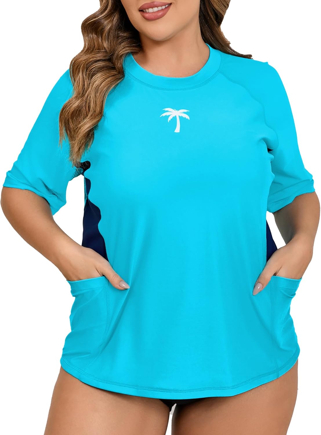 Halcurt is a professional manufacture and retailer for RASH GUARD and SWIM BOTTOMS. To achieve a continuous optimization for Halcurt products, we utilize the finest fabrics, design original printings and bold color combinations, so as to bring forth the fresh and new to the swimsuit industry, and most importantly, to your summer getaway outfits as well. [What is UPF 50+ fabric:]A garment permits less than 2 percent UV transmission is rated UPF 50+. [What enhances UPF ratings:]Dense fabric minimizes the transmission of UV. We use fabric over 200g, denser than normal fabric for swimsuits. [Why is Moisture-Wicking important:]By absorbing sweat away from the body, this help keep you cool in the summer. [Why is Quick Drying important:]Quick dry fabric allows excellent ventilation and breathability, dissipates heat easily. [Material:] 82% Nylon 18% Spandex [Package:] Rash Guard Top*1 [Size Guide](inch) [1X:] Chest: 43.5-46 Waist: 37-39.5 Hips: 45.5-48 [2X:] Chest: 46-48.5 Waist: 39.5-42 Hips: 48-50.5 [3X:] Chest: 48.5-52 Waist: 42-45.5 Hips: 50.5-54 [4X:] Chest: 52-56 Waist: 45.5-49.5 Hips: 54.-58 [Care Guide:] Do not iron Do not bleach Do not dry clean Do not tumble dry Line dry in the shade Use mild detergent only Do not use fabric softener Wash inside out with like colors Machine wash cold delicate cycle Rinse straight after use with mild detergent [Customer Service] We dedicate to provide buyers the best shopping experience. Should you encounter any problems like receiving Wrong Size/ Wrong Item/ Defective Product or simply just can't design on the size, please feel free to contact us, we'll reply your request within 24 hours.
