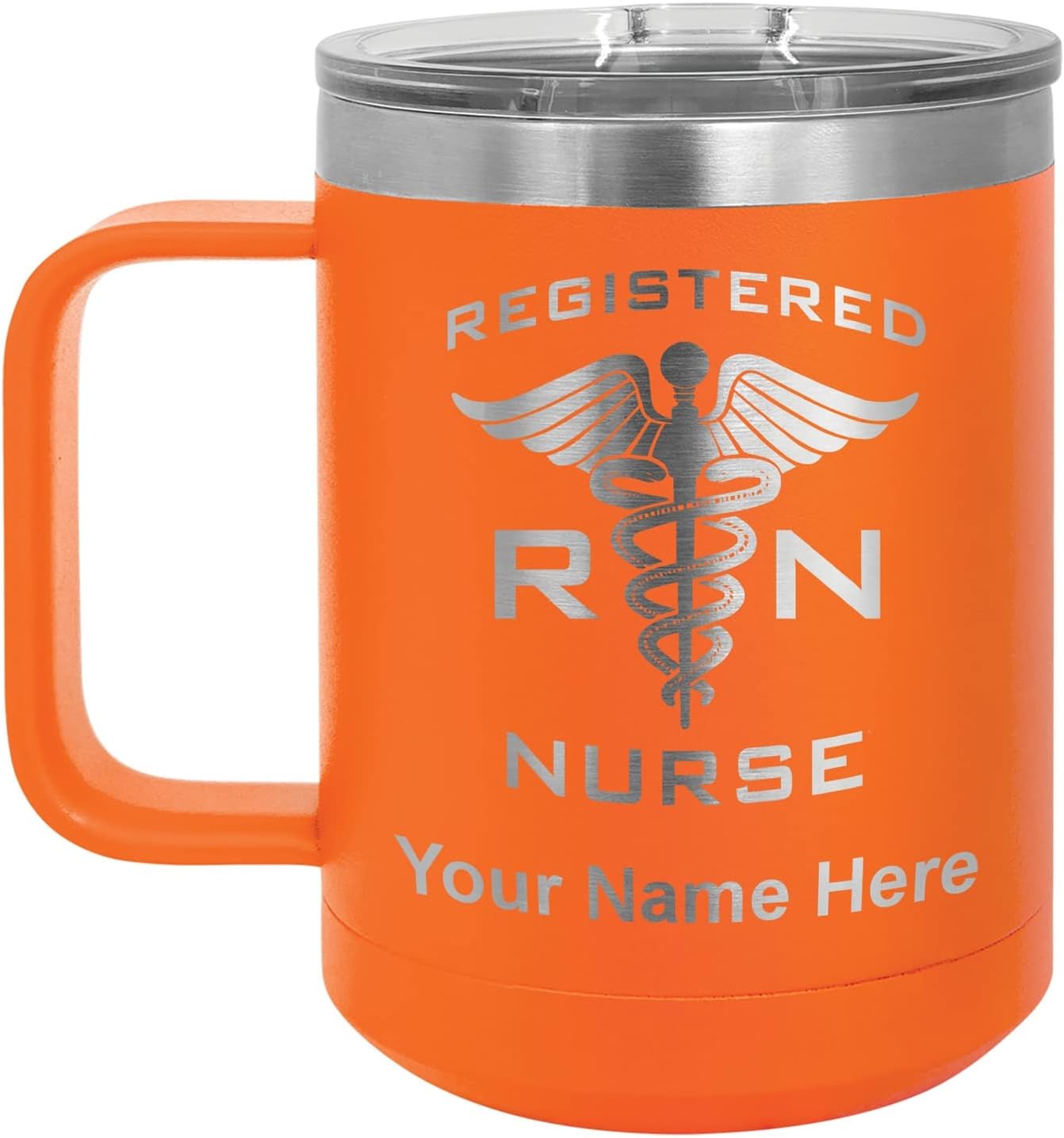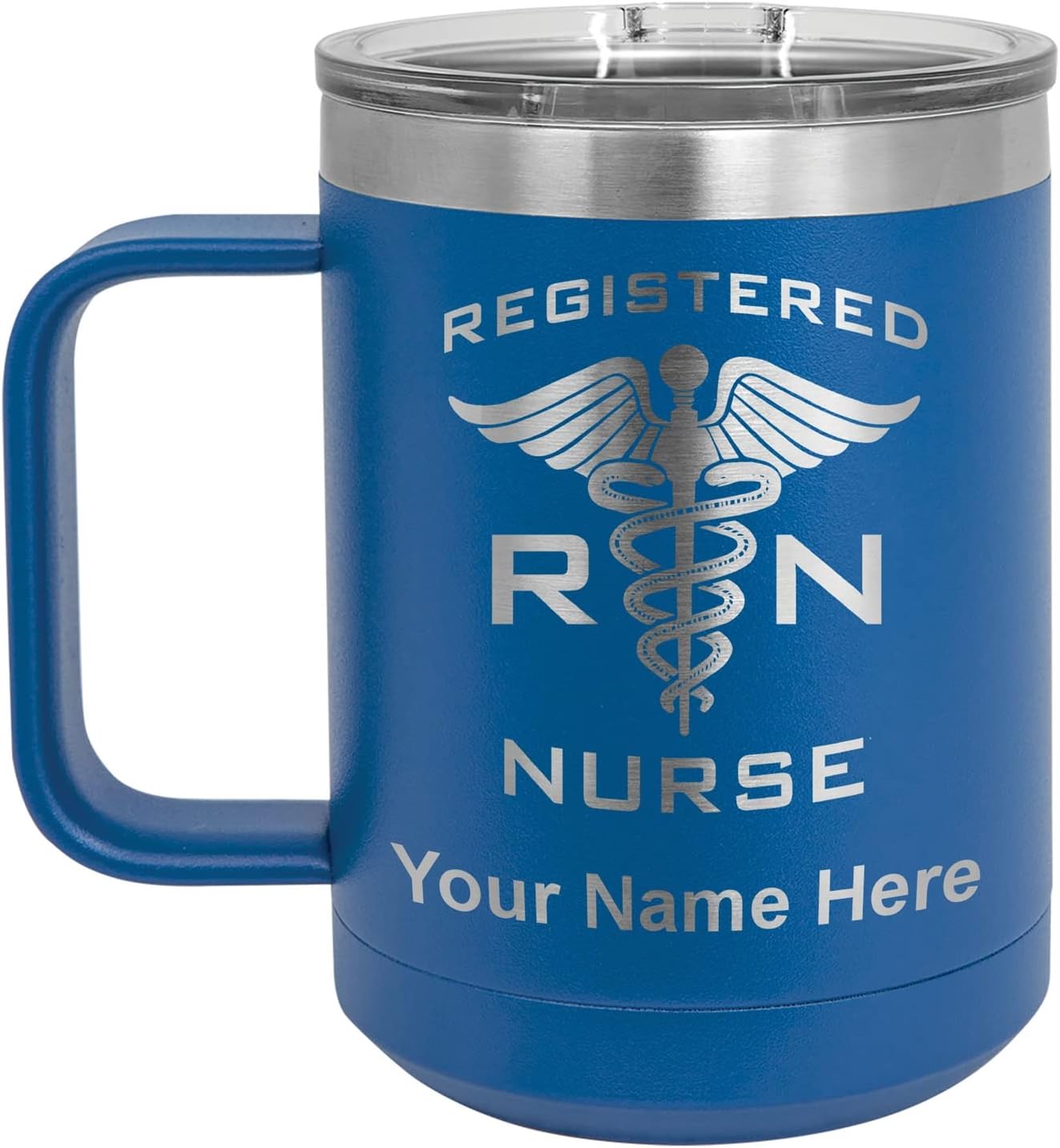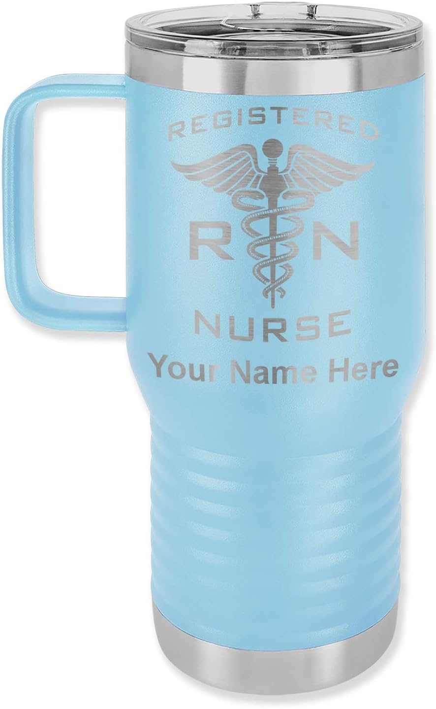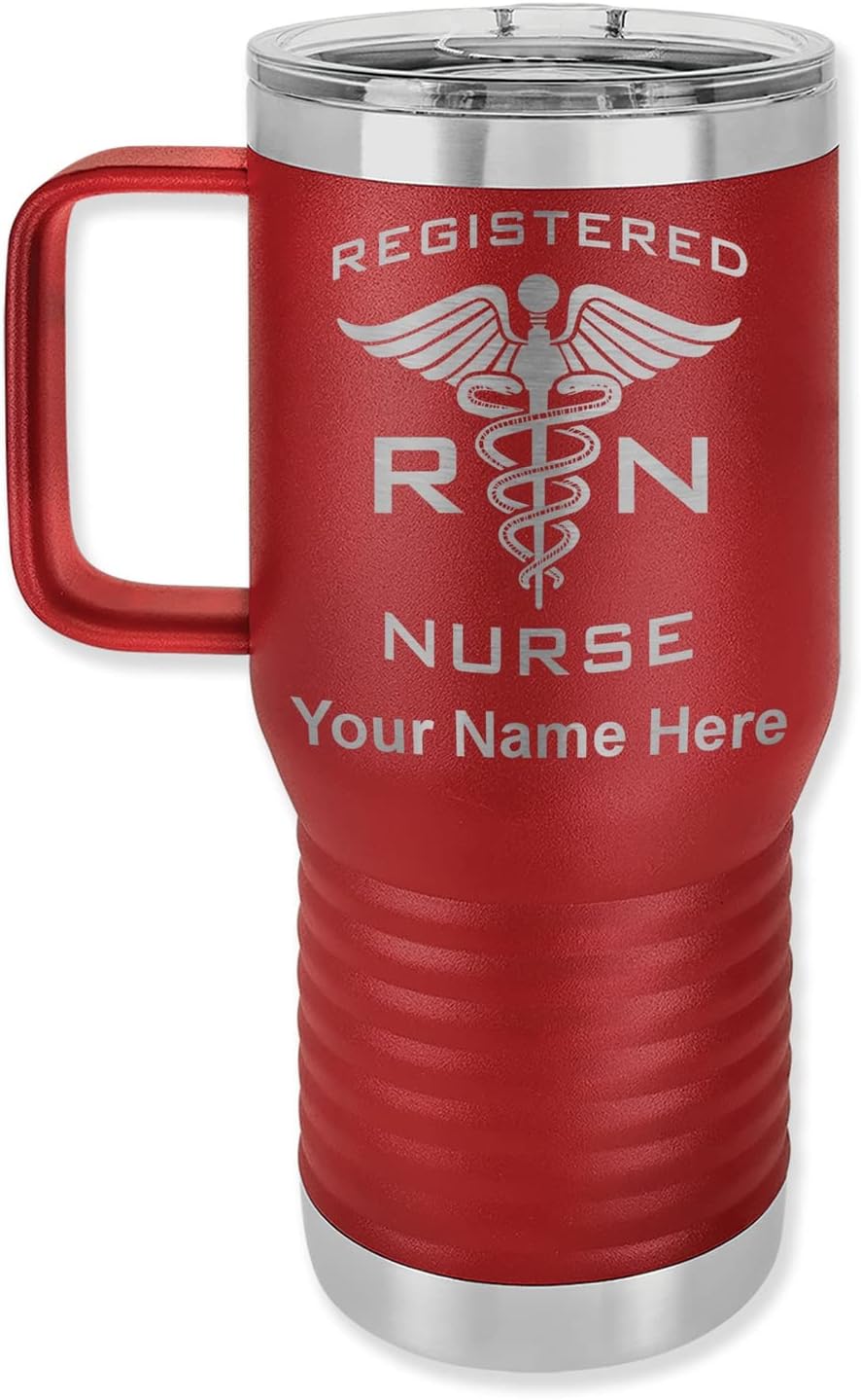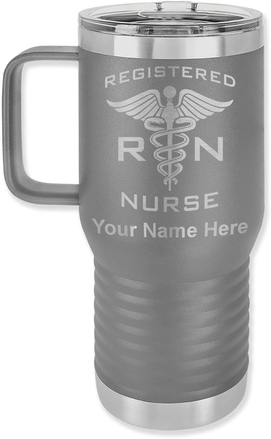 LaserGram 40 ounce Travel Mug with Handle that is laser engraved with the image that you see in the photo. Your own personalized text will be laser engraved below the image. Features double-walled stainless steel vacuum insulation with a clear lid. Click the "Customize Now" button to begin customizing your mug.