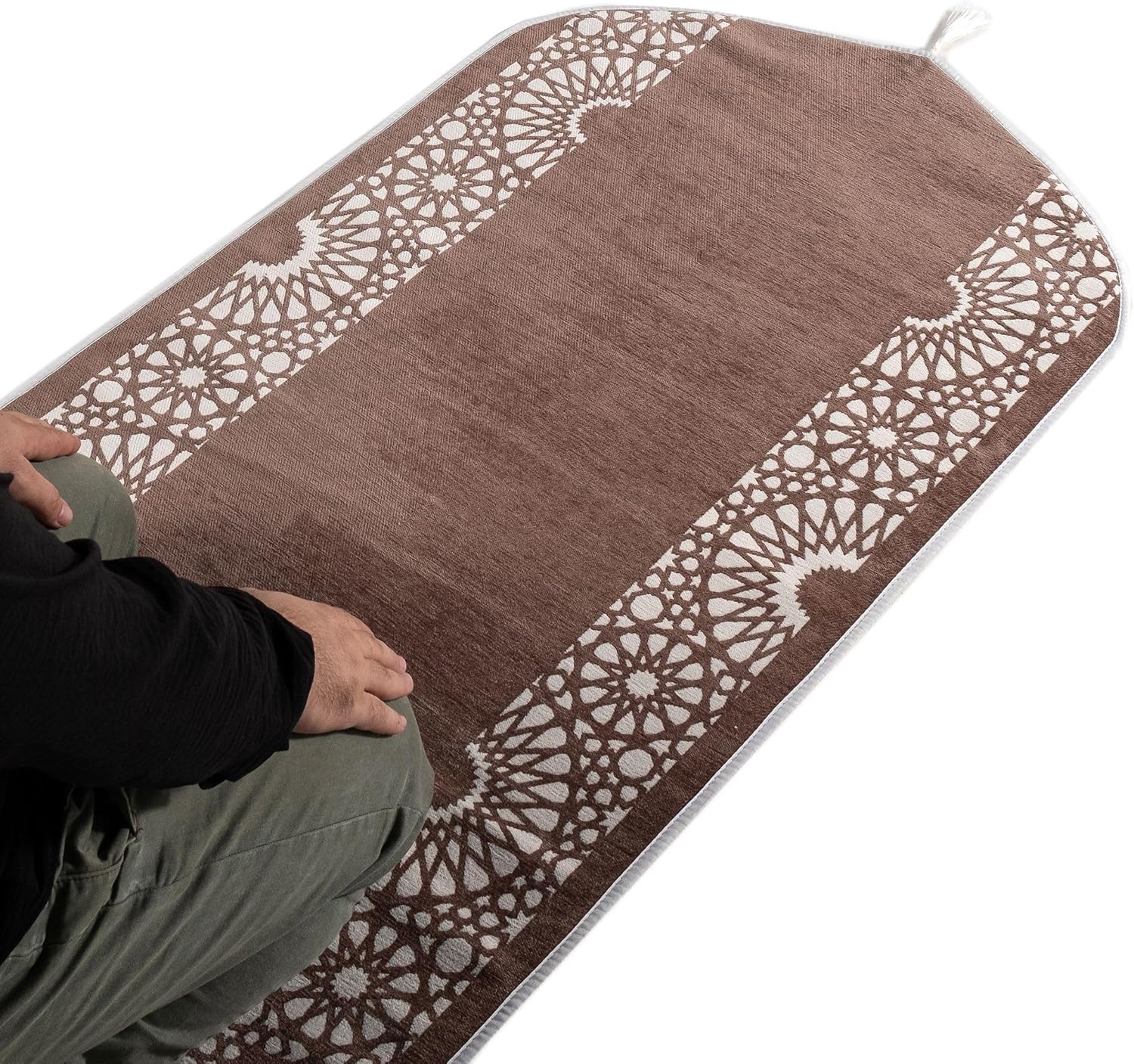 Modefa's foam chenille prayer mats are quality janamaz that are great for anyone who needs extra padding comfort during salah! WHY WE LOVE IT Its unique dome shaped design and foam insert make it a great choice for anyone needing a barrier between them and hard surfaces during namaz! On top of that, it features the Islamic geometric star pattern (also referred to as Selcuk or Seljuk pattern in Turkey), and comes equipped with a neat carrying bag so you could store it with you on the go! QUALITY YOU CAN FEEL These sajjada are machine made, but hand-finished with the best workmanship Turkey has to offer. Each prayer rug is inspected for defects before shipping to our customers.BR> THICKNESS -- 8.5/10 Our Modefa Thickness Rating on this prayer rug is an 8.5 out of 10. This means it is thicker than most prayer rugs, and is one of the thickest prayer rugs we carry; they are a little thicker than our Double Plush rug. This makes it great for using on harder floors! MATERIAL Chenille with a foam insert. 80% Polyester, 20% Cotton.BR> CARE Clean with a damp cloth when needed. We do not recommend machine washing or drying due to the foam. _________________ Weight: 1.75 lbs Size: 67 x 130cm with 4 cm fringe at bottom (26.4 x 51.2in; 1.6in fringe at bottom.) 8mm thick (0.31in thick). Made in Turkey DID YOU KNOW? Around the world, Muslims call prayer rugs by many different names! In English they may say prayer mat, salat mat, or prayer carpet; in other languages they may say janamaz, sajada, musala, namazlik, or seccade, just to name a few!