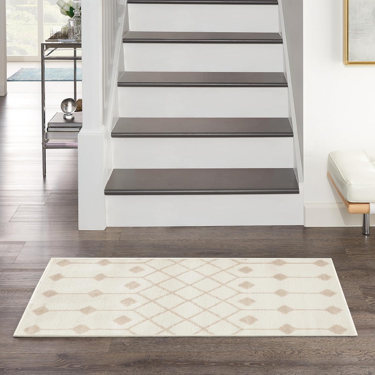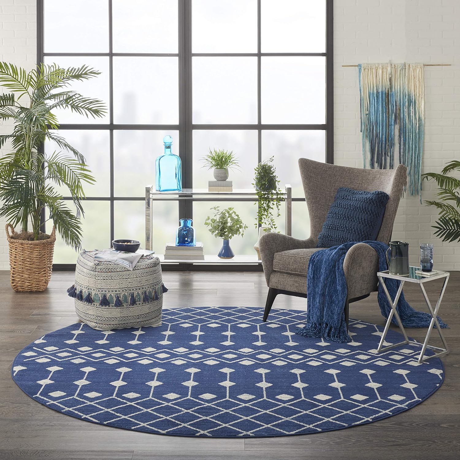Beautifully bold and gorgeously graphic, the Grafix collection of area rugs from Nourison is destined to deliver a transfixing touch of dramatic appeal to any room. These contemporary rugs are available in an enthralling array of color palettes and power-loomed from long-lasting and fabulously-textured polypropylene for outstanding ease and sensational style. The Moroccan diamond bead pattern of this Grafix area rug creates a dimensional op-art look that draws the eye and pulls a room together. The soft combination of grey and ivory creates a subtle yet stunning focal point for the contemporary home.