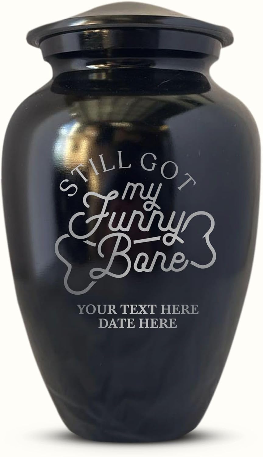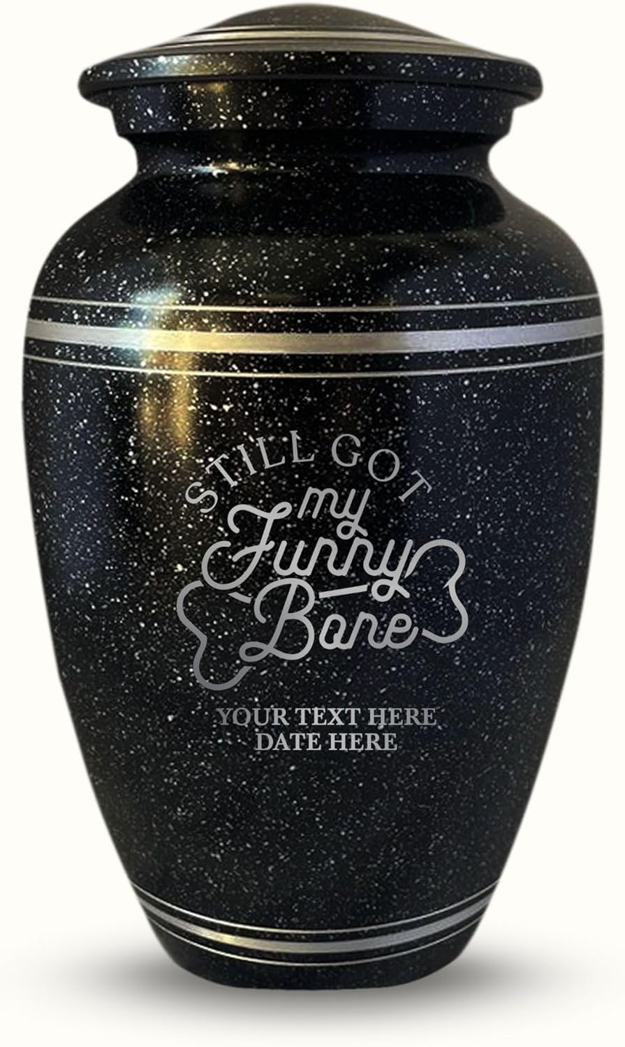 This collection is not for everyone but was inspired by a very special person before she passed on, we miss you Grandma Sue. Introducing our Playfully Distressed Finish Personalized Human Urn – an aluminum memorial thoughtfully designed to honor your loved one with both grace and a dash of humor. This captivating black urn, adorned with a charming distressed finish and a whimsical silver rim, exudes a timeless and lighthearted character, creating a truly unique and memorable tribute. Measuring 10.35" x 6.75", this urn not only provides ample space for cherished memories but also features practical details like a felt-lined bottom, moisture prevention paint, and a threaded lid closure for added security. With the capacity to hold the remains of a person weighing up to 200 lbs, it ensures a dignified and amusing final resting place. Personalize it with silver/steel engraving to forever capture your loved one's name or a special message, infusing a touch of sentiment into the laughter. With its distinctive black design and silver rim, complemented by thoughtful interior features, this urn becomes a symbol of enduring love and offers a secure and humor-infused sanctuary for your cherished memories.