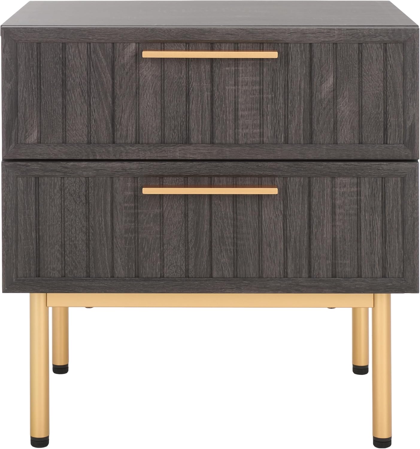 Uplift your bedroom with the sleek style and modern functionality of our Axelle nightstand. Crisp and clean-lined, our nightstand remains the perfect complement to any modern or contemporary bedroom. Wooden cladding on the facade adds a touch of sophistication to the modern side table. Completed with a bleached white finish, the nightstand beautifully showcases the organic grains of wood. It is perched upon gold metal legs to attain a sleek and charming presence. Our nightstand features two roomy drawers to offer stylish and practical storage for any bedroom.