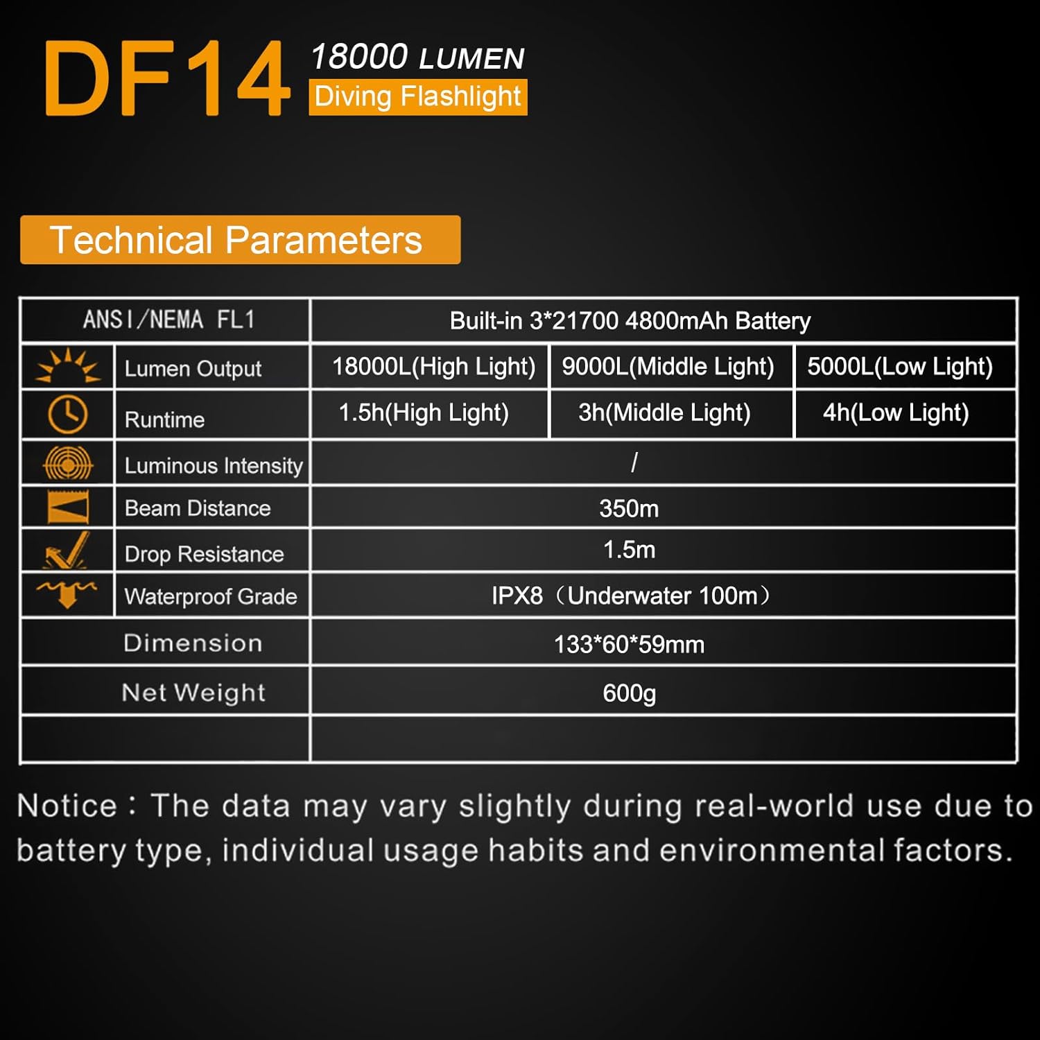 | Included Components | 1 x Arm Ball, 1 x DF14 Diving Flashlight, 1 x Handle, 1 x USB Charging Cable |