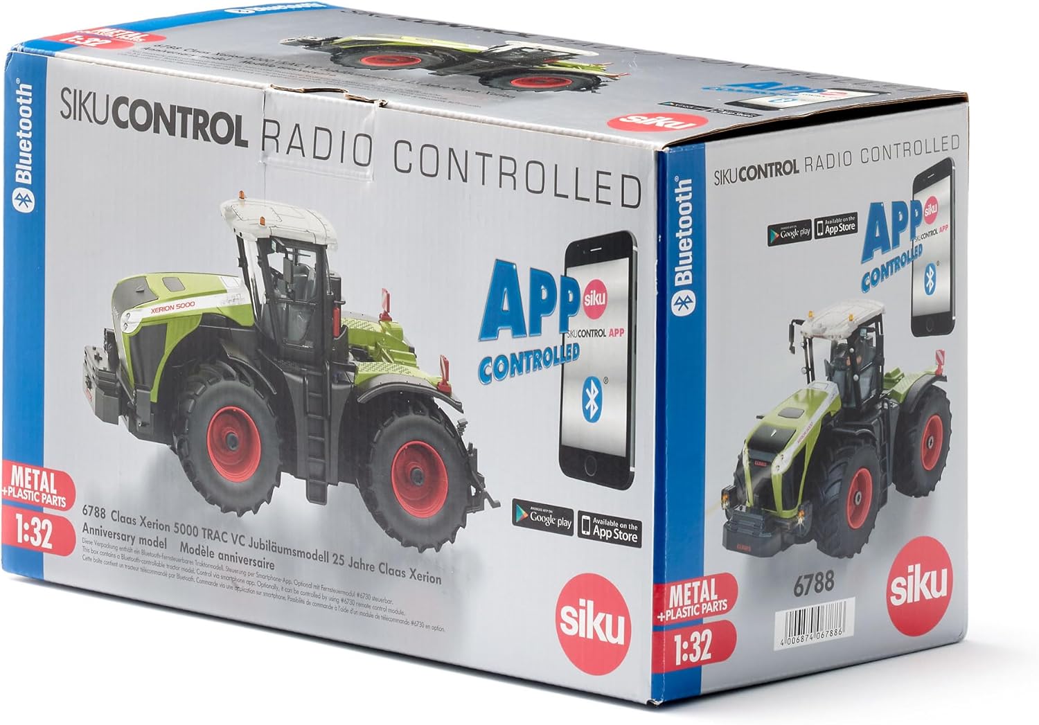Detailed Claas RC tractor for the 25th anniversary of the Xerion model for play and fun, Control via Bluetooth app - Numerous functions: 6 transmission boxes, electronic rear coupling, front steering possible, four-wheel and crab, rotating cab, 22 LED lights - Great stability: Most of it is metal, rubber tyres, suitable for tiles, parquet or even carpeting. a, High level of security Thanks to automatic disconnection (sliding clutch) - Tractor operation with 3 AA batteries, Simple control: control of all functions via the app, Use of several tractors is possible with the app - Contents: 1x Siku 6788, Claas Xerion 5000 TracVC Model Anniversary 25 years Claas Xerion, Without control module, Scale: 1:32, Metal/ Plastic, Dimensions: 10. 1 x 11.2 x 12.7 cm, Weight: 1.04 kg, Green, Series: SIKU CONTROL