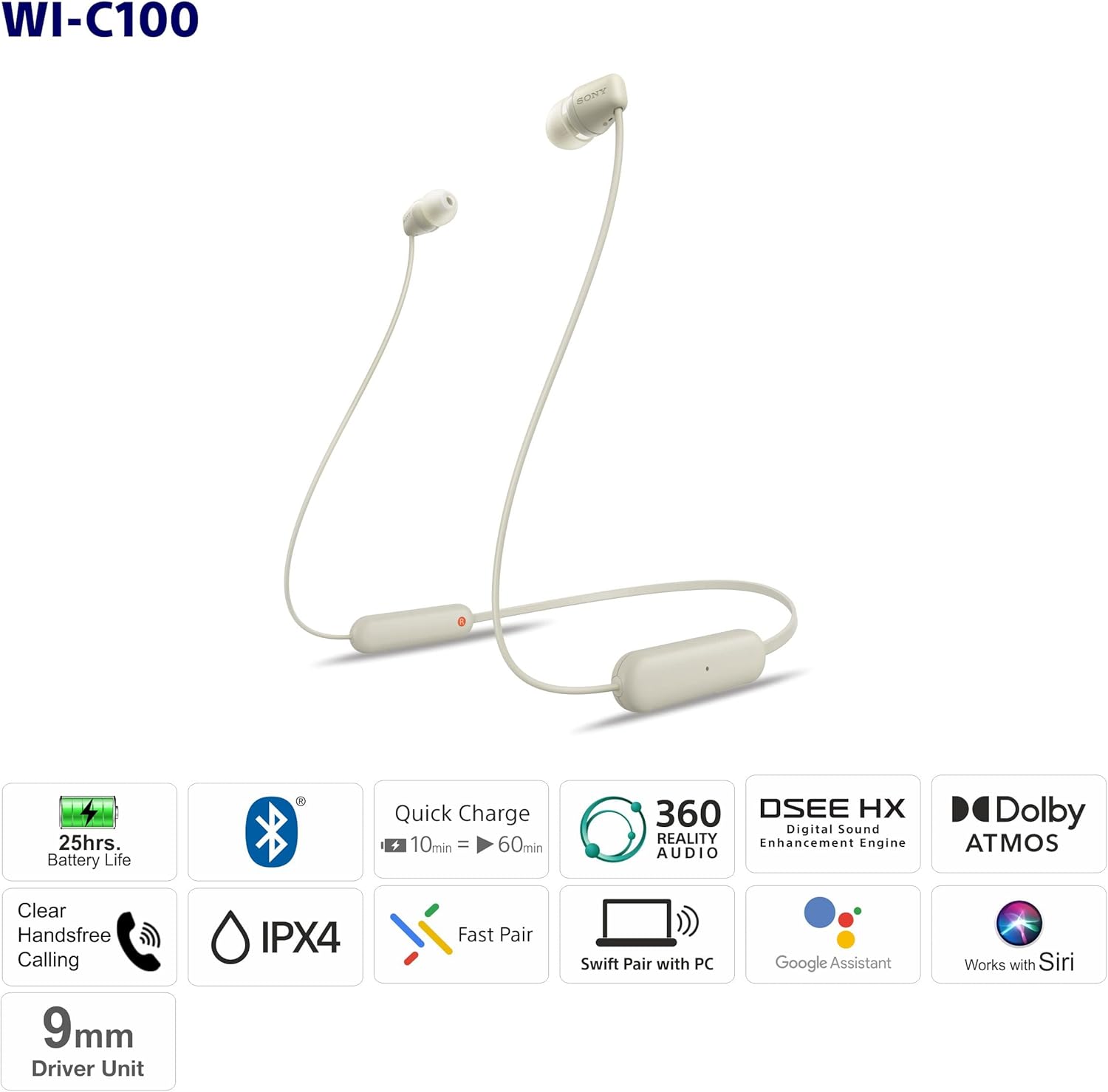 Sony WI-C100 Casque Sans Fil Ecouteurs Appels/Musique Bluetooth Beige