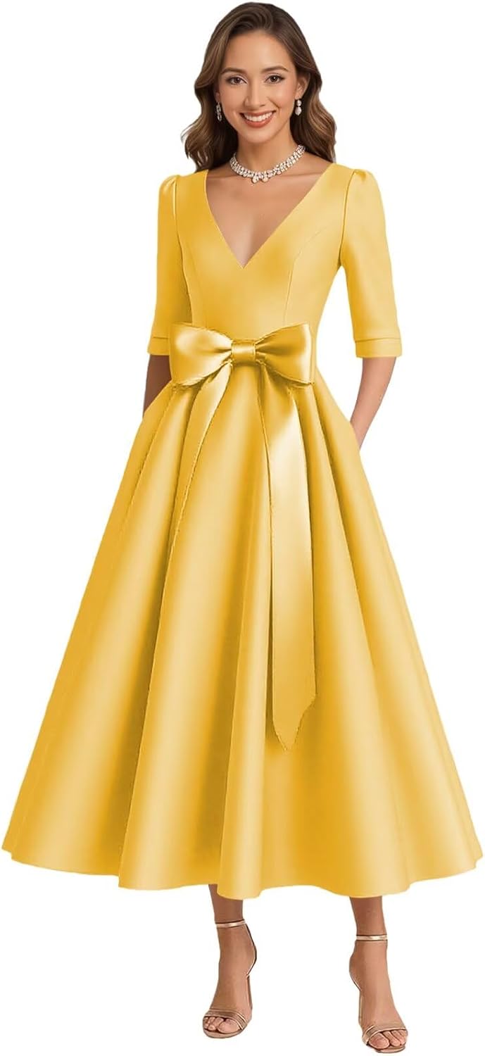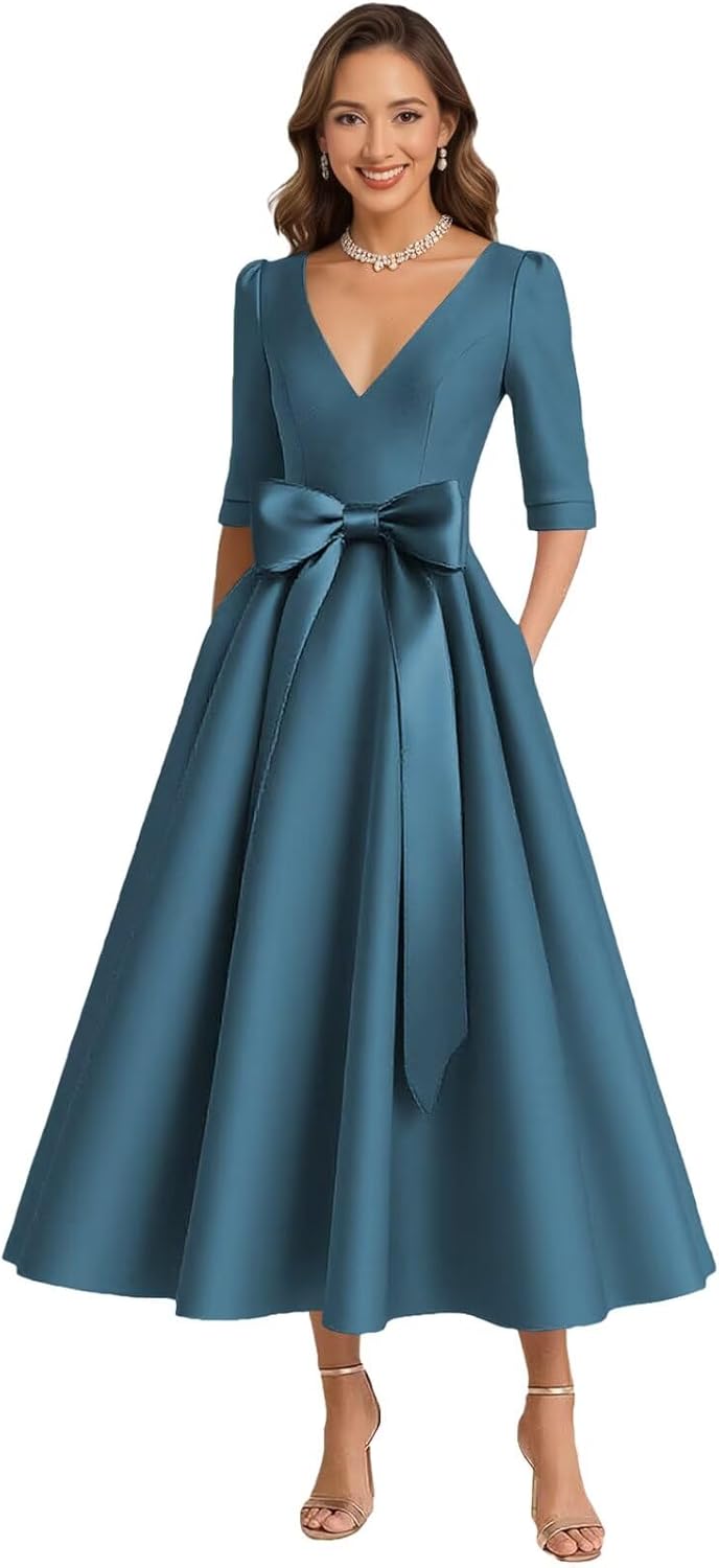 Welcome to our store, we have a variety of different styles for your choice.Satin Mother of Bride Dresses Tea Length A Line V Neck Formal Wedding Guest Dress with Half Sleeves Evening Party GownFabric: SatinNeckline: V-NeckSleeve: Half SleeveSilhouette: A-LineDress Length: Long, Tea LengthCustom Made Service:If you can't make sure your size,just order the similar size then e-mail us your measurement details as list.1. Bust _____Inch2.Waist _____Inch3.Hips _____Inch4.Shoulder to Shoulder ____Inch5.Shoulder to floor ___Inch6.Height: _____Inch7.The height of your high heel shoes: _____Inch8.The date you need the dress_____Seller Return PolicycIf dress has any problem, please feel free to contact us, we will give you a satisfactory solution.NOTICE: Satin Mother of The Bride Dresses, Mother of The Groom Dresses, Formal Dresses, Grandmother of The Bride Dresses, Mother Dresses. The real color of the item may be slightly different from the pictures shown on website because of different monitors