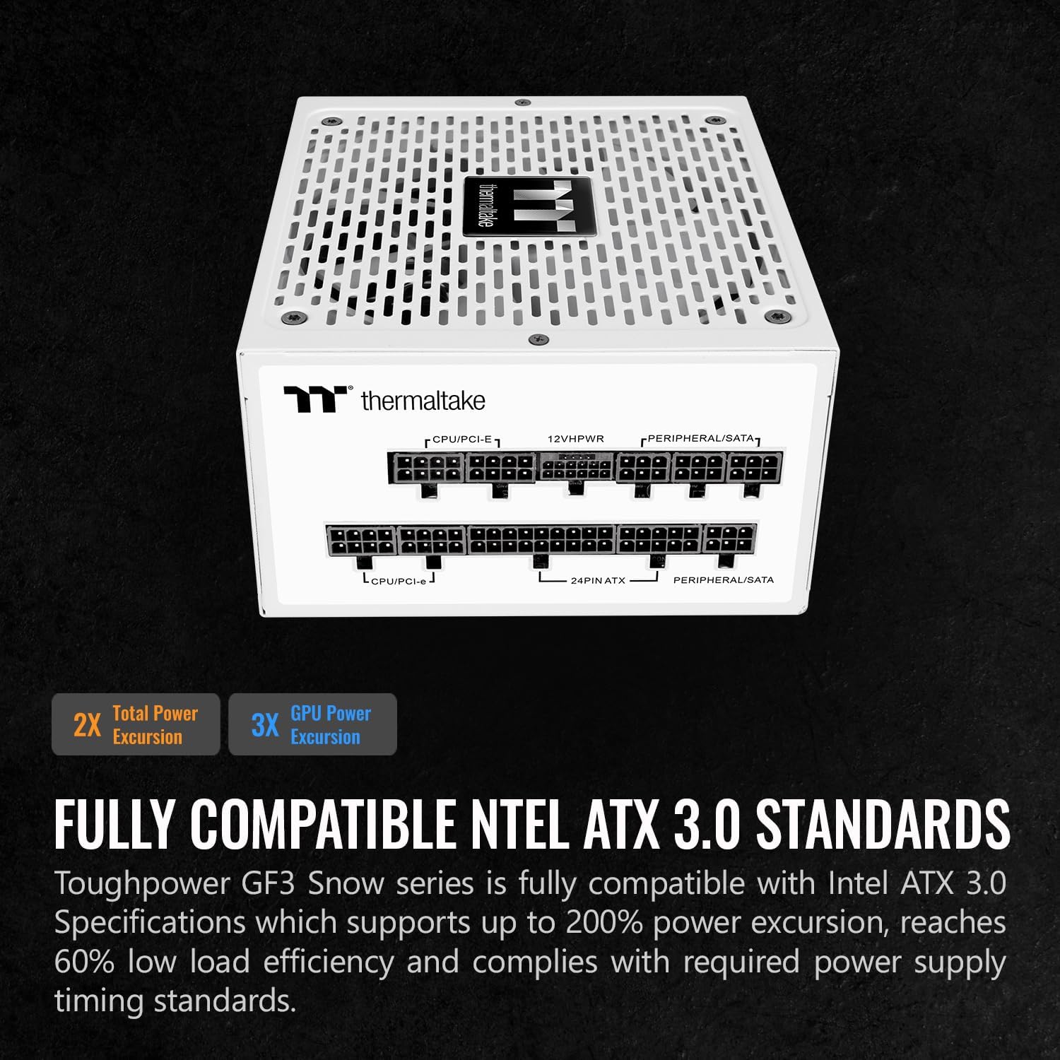 Designed with a native PCIe 12+4pin connector, the Toughpower GF3 series is compatible with Intel ‘s ATX 3.0 specification and is built for next-gen PCIe 5.0 graphics cards. Capable of delivering up to 600W of power to PCIe 5.0 graphics cards. •P/N: PS-TPD-1350FNFAGU-4 •WATTS: 1350W •MODEL: TPD-1350AH3FSG •MAX. OUTPUT CAPACITY: 1350W •COLOR: Black •DIMENSION ( W / H / D ): 150mm(W) x 86mm(H) x 180mm(D) •WEIGHT: 1.83 KG •PFC (POWER FACTOR CORRECTION): Active PFC •POWER GOOD SIGNAL: 100-250 msec •INPUT CURRENT: 16 - 8A •INPUT FREQUENCY RANGE: 50-60Hz •INPUT VOLTAGE: 100 – 240V~ •OPERATING TEMPERATURE: 0°C to + 50°C •OPERATING HUMIDITY: 20% to 90%,non-condensing •STORAGE TEMPERATURE: -40°C to + 70°C •STORAGE HUMIDITY: 20% to 90%, non-condensing •COOLING SYSTEM: 14cm hydraulic bearing fan •EFFICIENCY: Meet 80 PLUS®Gold at 115Vac input. •MTBF: 100,000 hrs minimum •SAFETY APPROVAL: •CE/UKCA/cTUVus/TÜV/FCC/IC/BSMI/EAC/CB/BIS/KCC •PCI-E 6+2PIN: 6 •PCIE 12+4PIN: 1