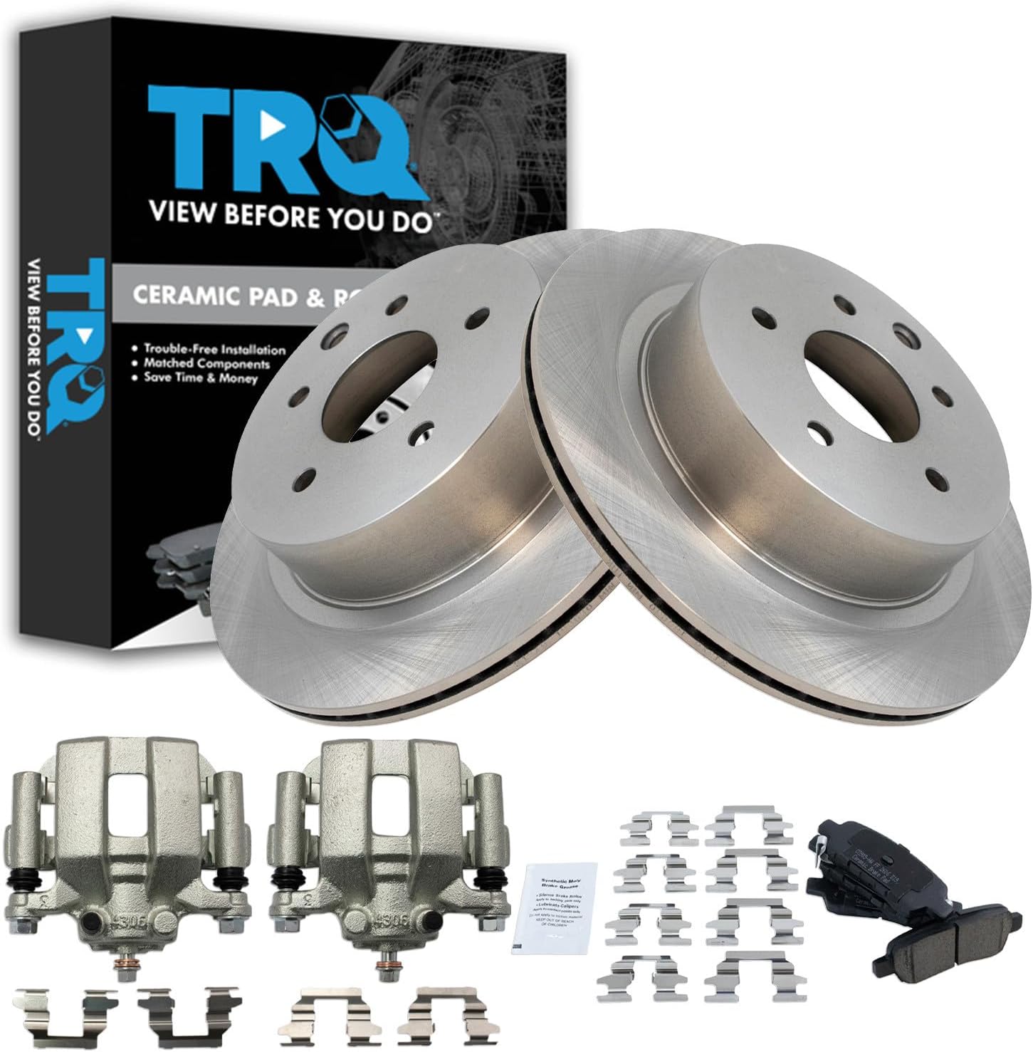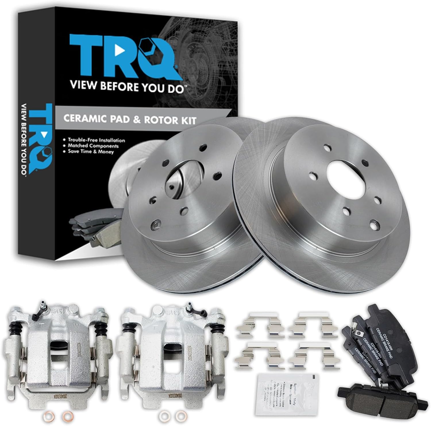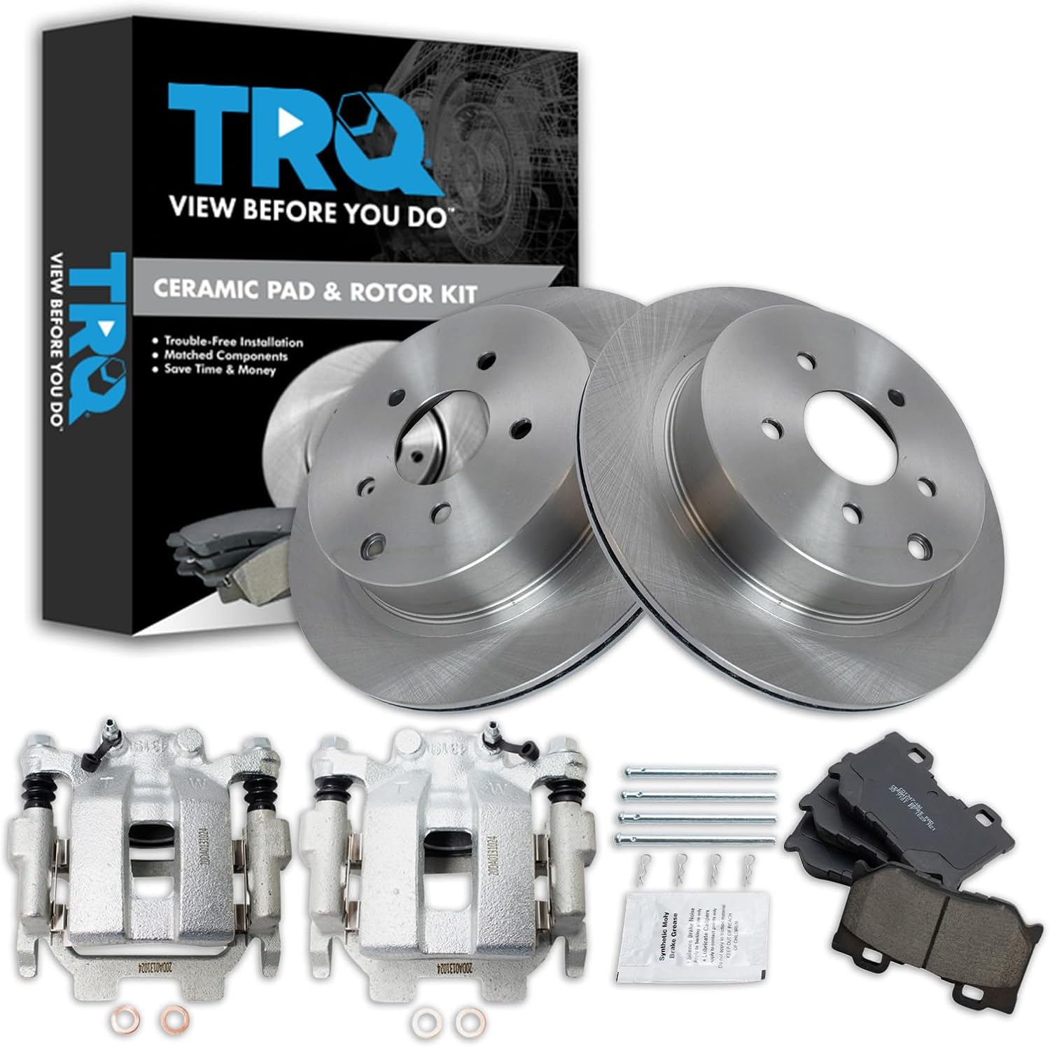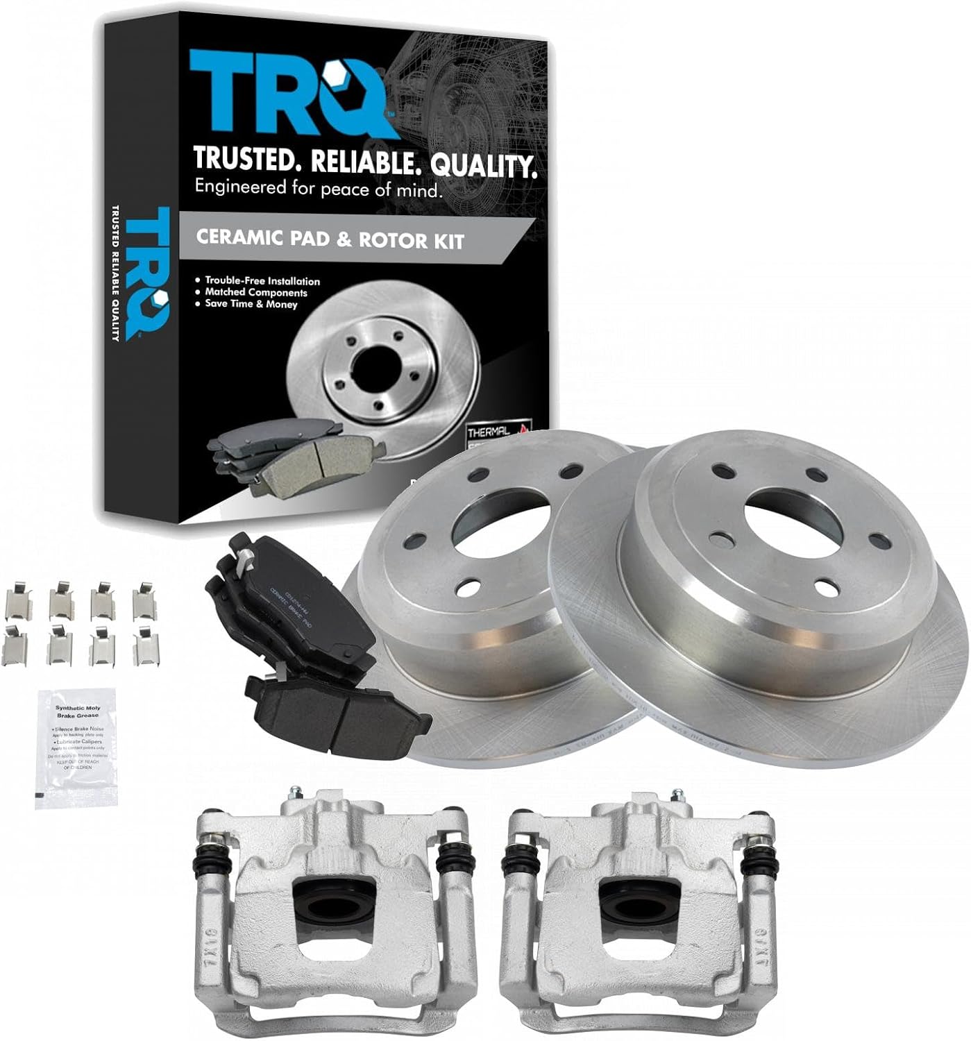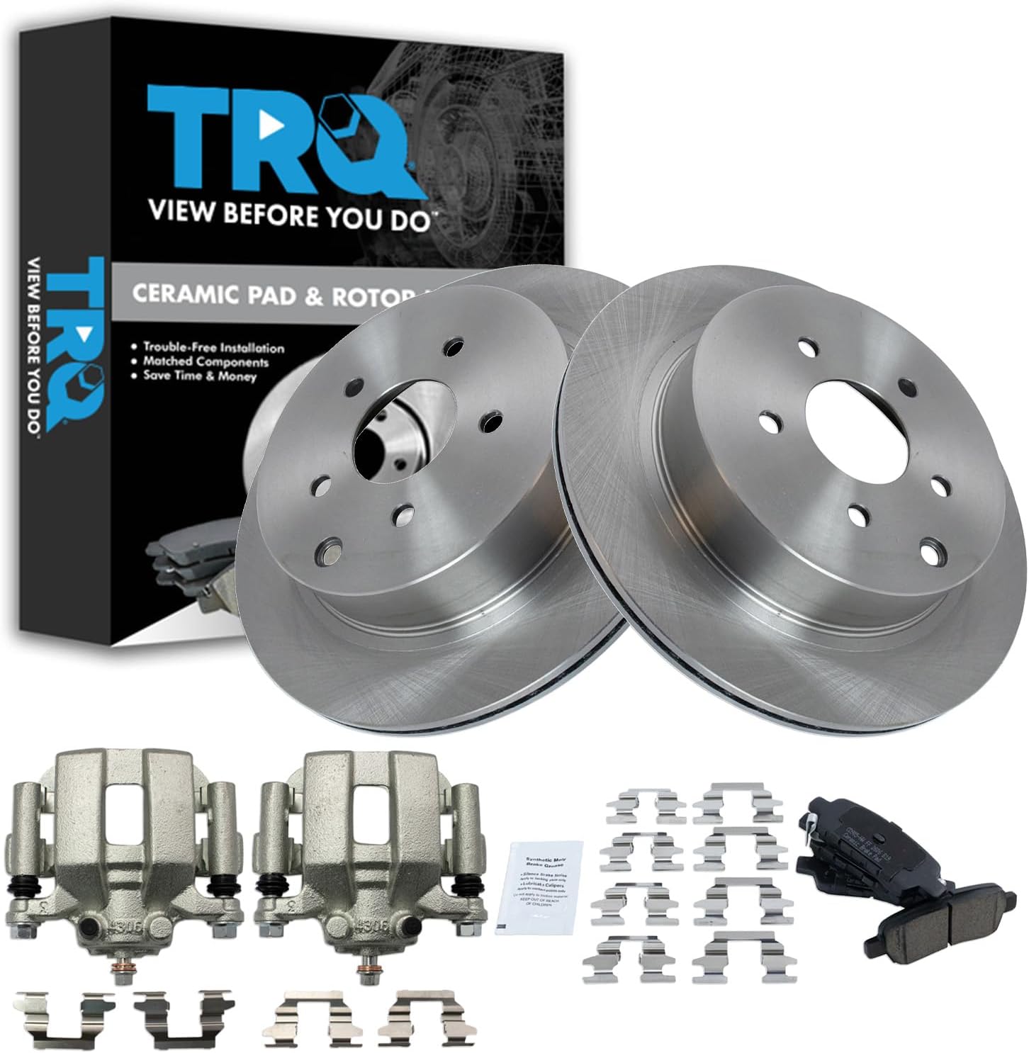 Ceramic Brake Pad & Rotor KitKit Includes(1) Rear Ceramic Brake Pad Set(2) Rear Brake Calipers(2) Rear Brake Rotors11.50 in. (292mm) Brake Rotor DiameterFitmentNissan Rogue 2008-13 - RearNissan Rogue Select 2014-15 - RearProduct AttributesFriction Material Composition: CeramicBrake Rotor Diameter: 11.50 in. (292mm)Wheel Lug Count: 5 LugBrake Pad Friction Material: CeramicBrake Pad Bonding Type: Premium PosiBrake Rotor Venting Type: VentedProduct Features Positive Molded - Less dust resulting in clean wheels G3000 Casting Alloy - Reduced noise and improved wear resistance Application Specific Design - Extended service life, no modificationsItem DetailsTRQ brake kits are designed to restore your brake system to like-new performance. TRQ brake pads are positive molded, thermal scorched, chamfered, and utilize a multi-layer shim for enhanced performance and service life. TRQ rotors have a non-directional finish that reduces the break-in period for new rotors as well as reducing vibrations throughout the rotor’s lifecycle. All products are fit and road-tested in our Massachusetts R&D facility to ensure we deliver on our promise of Trusted Reliable Quality.Reference Numbers10-7250S10-7251S10-C725010-C7251141.42579141.425818FR1255918FR1256019-B343619-B343719B343619B343722-00630L22-00630R31349331-67660331-67661440608H38544060AL58544060AL58644060AM48544060CB10J44060EG00J44060EG00K44060EG085980113980113FZN980113P980113R99-00630L-C99-00630R-CBD126093BR31349C42579C42580D40608H385EHT1288AHEHT1288HEHT905HFRC12559FRC12560MGD905CHPRT5536ZD1393