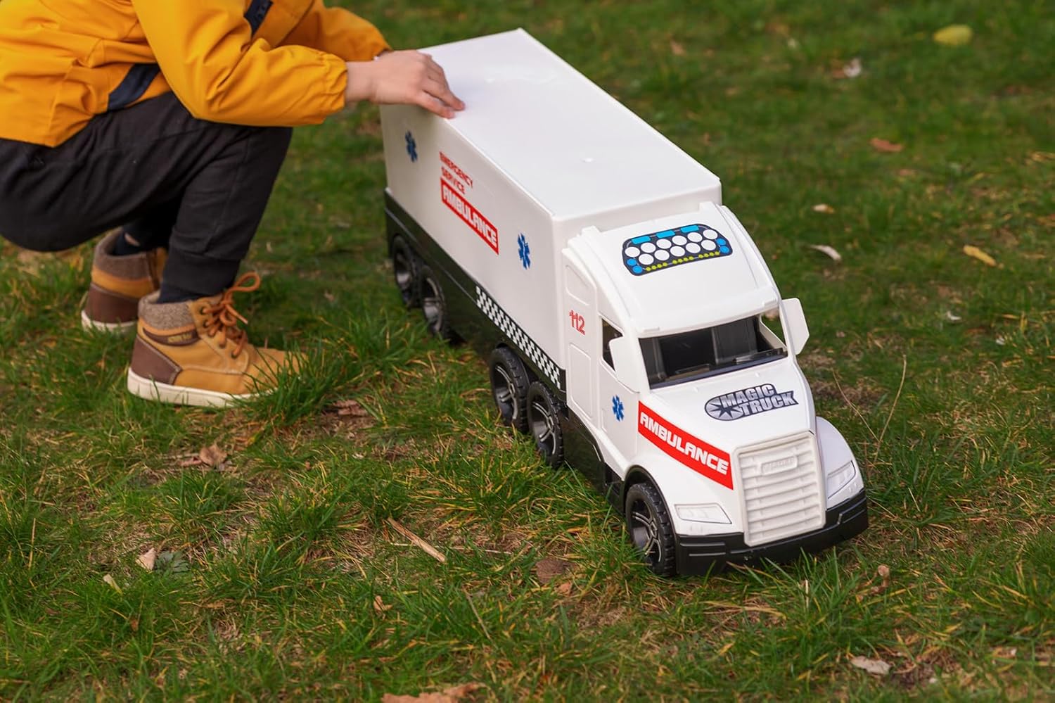 With the Magic Truck vehicles, even the smallest ones can emulate their big idols. The ambulance is approx. 79 x 28 x 19.5 cm and equipped with a side door. The fluorescent headlights glow in the dark. In combination with other toys and vehicles from Wader boys and girls can recreate many imaginative situations. This promotes motor skills, coordination and social behaviour and stimulates the child's imagination. The toy is made of robust plastic, is free from any harmful substances, high-quality workmanship and therefore particularly durable.