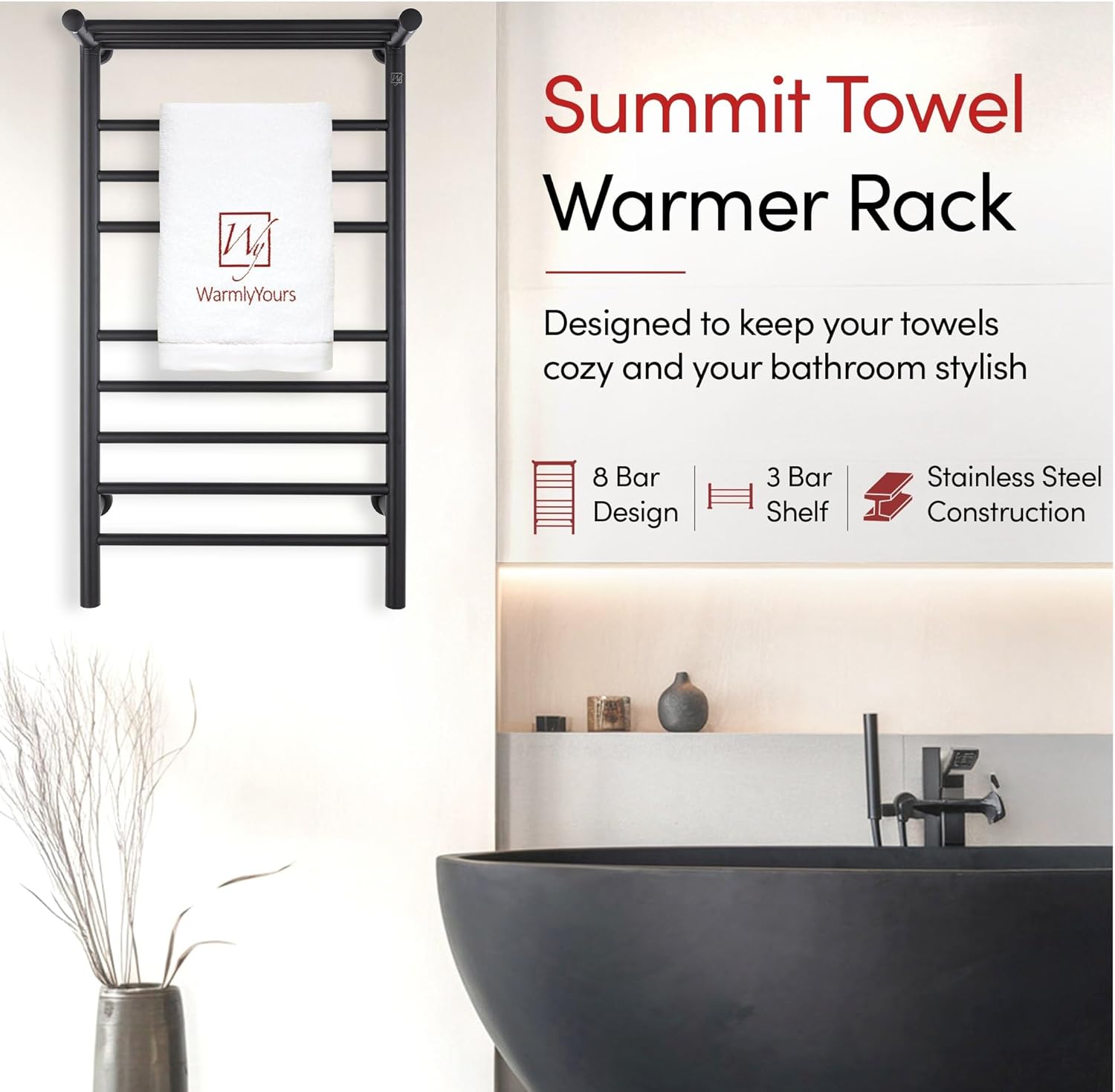 The Summit towel warmer is an exciting blend of attractive, modern design and practical functionality. With 8 main heated bars, the Summit is able to accommodate 2 large towels or a bathrobe while the heated 3-bar shelf can keep additional towels toasty. The Summit is made of durable stainless steel and features a polished stainless steel finish that is both attractive and easy to clean. This towel warmer is also dual connection, meaning it can be used “as is” to plug into a standard 120 VAC outlet or it can be modified by a licensed electrician to have a hardwired 120 VAC electrical connection. And when this towel warmer is installed with a hardwired electrical connection, its unique design means there is no unattractive and cumbersome cover plate required. Additionally, this towel warmer is extremely safe and is cETLus listed. The Summit comes with an LED power switch and TempSmart overheat protection to prevent the unit’s surface temperature from exceeding 167°F (75°C). The Summit is covered by our 2-year manufacturer’s warranty for peace of mind. Optional towel warmer controls sold separately.