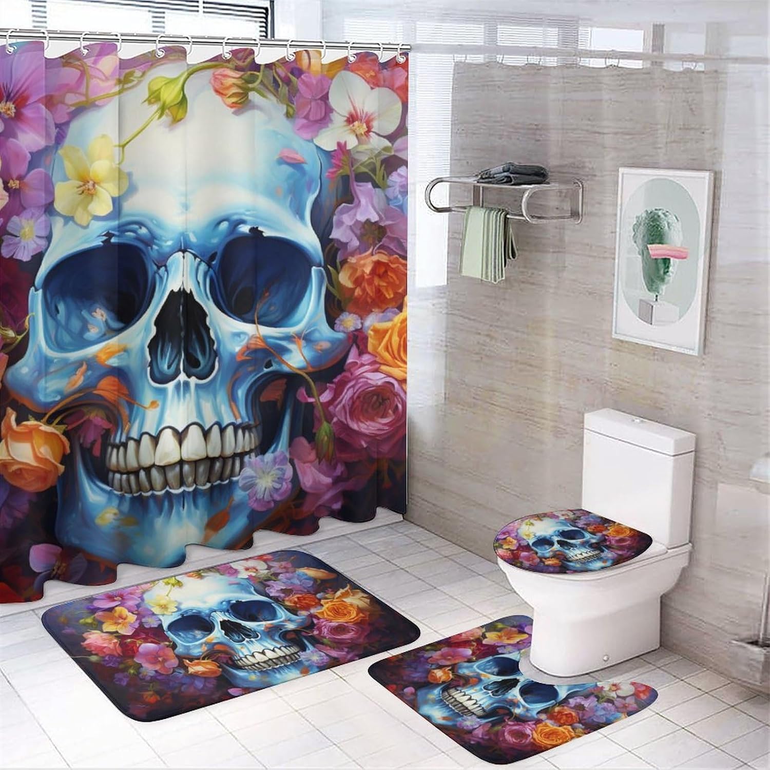Accessories construction : Floor mat + U-shaped floor mat + Toilet seat cover cover + Shower curtain (with 12 C-shaped plastic hooks) Material: This four-piece set is made of coral velvet + waterproof oxford fabric, the fabric is soft and delicate, skin-friendly and comfortable, with a good sense of touch. coral velvet floor mats are super absorbent, non-slip.EASY TO CLEAN: It's very easy to clean and maintain, usually cleaning just need a hoover to absorb the dust, easy to store and easy to take care of on a daily basis. When not in use, gently roll it up and put it in the corner, it can be used for a long time.WATERPROOF: This shower curtain is made of waterproof Oxford cloth, waterproof performance is good, you can avoid water spraying to other places in the bathroom.Applicable Scenarios : Suitable for home bathroom, guest room, bedroom, living room and other places.Washing instructions: washable, not machine washable.After-sales Service:If you are not satisfied with our printed paintings, please feel free to contact us and we will answer you in the shortest possible time. Your satisfaction is our only pursuit.